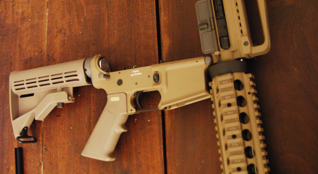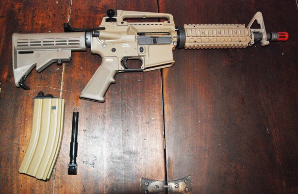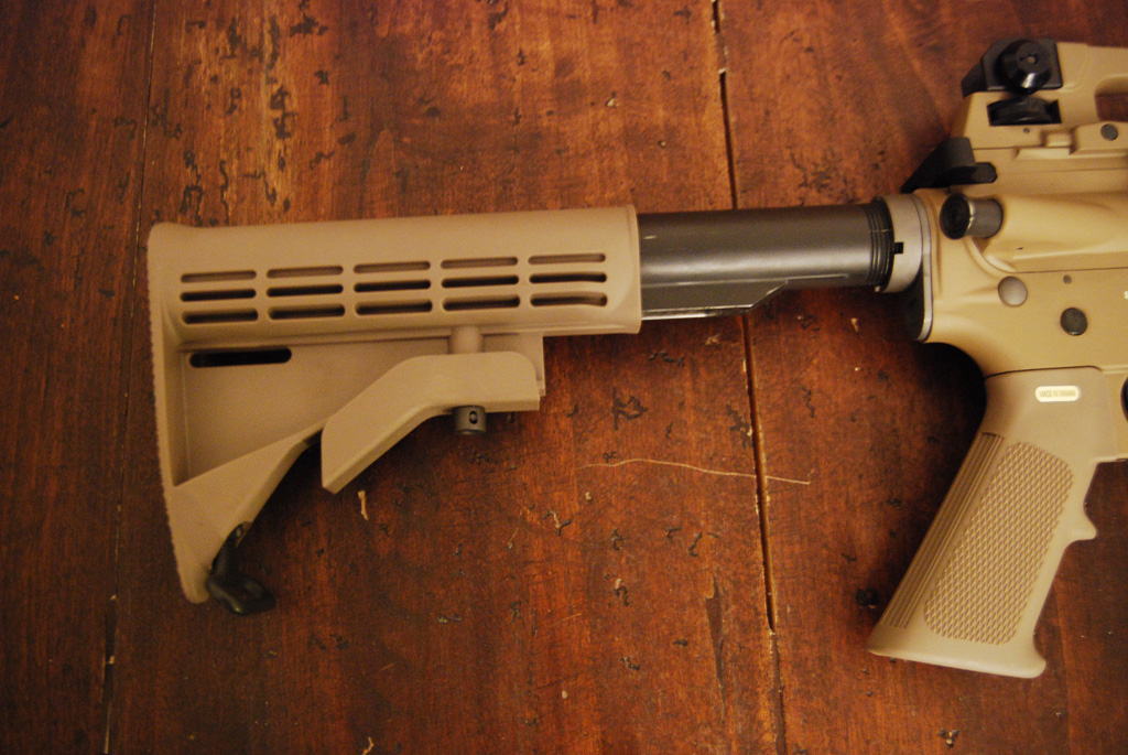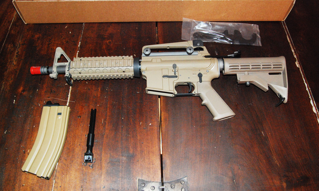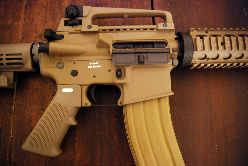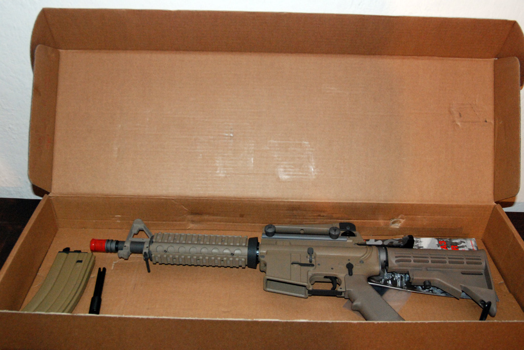 Full metal, questa versione, colorata tan, è già provvista di ris e di caricatore per il co2. L’imbraccio del fucile è comodo (come tutti gli m4), il calcio regolabile ha però solo 4 posizioni,