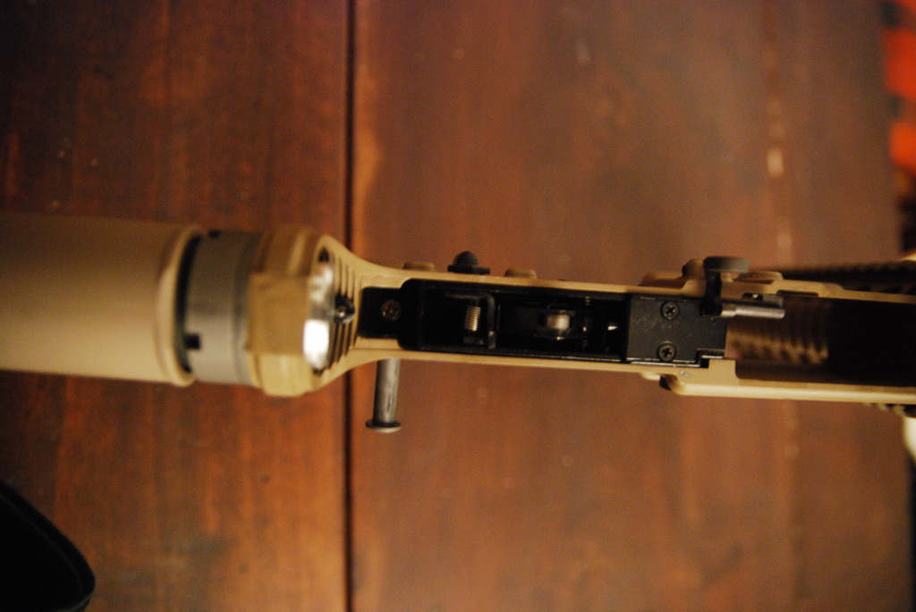 Aprire il fucile è semplicissimo con l’ausilio dei due pin ai lati del corpo. Niente di trascendentale, tutti i gbb si aprono così, ma se paragonato agli asg…..dove tra viti e vitine, gear box & co, c’è da impazzire.Aperto in due, abbiamo immediato accesso al bolt e al cilindro in ottone, cuore del meccanismo di sparo, basta tirare e avremo subito tutto in mano, pronto per manutenzione(è sempre bene tenere il bolt bello ingrassato per evitare rotture).