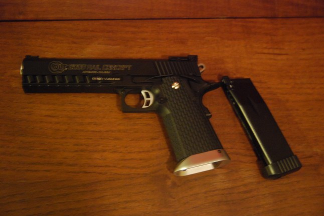 In conclusione è una pistola pesante e grossa, che scalcia come un mulo, molto più della desert a co2 per intenderci, ma che spara come un fucile, anzi meglio, ho visto pochi fucili sparare così bene in modo così costante, forse solo l’m4 sistema,che ho provato lo stesso giorno (col cilindro da novanta ovviamente) e non esagero, vedrete adesso che posto il video…..noi l’abbiamo adottata per il tiro dinamico, non amando quelle a tamburo.