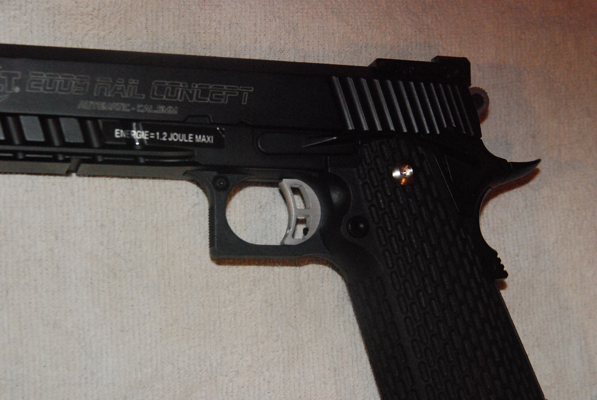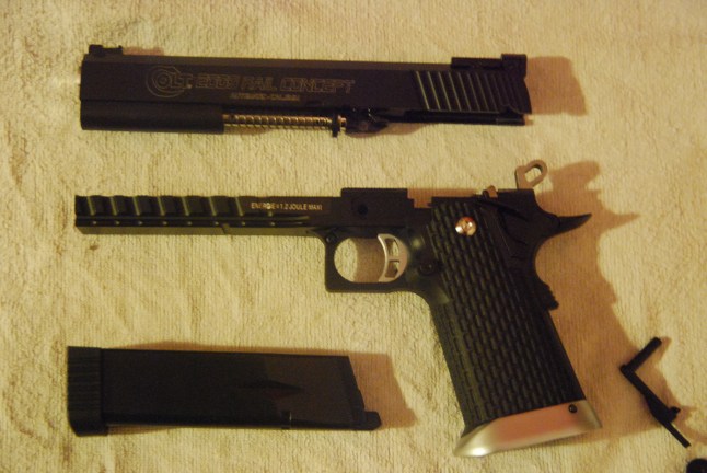 E’ una pistola molto grande, ed’è discretamente pesante essendo full metal, in compenso ha il rail per la torcia o laser che sia