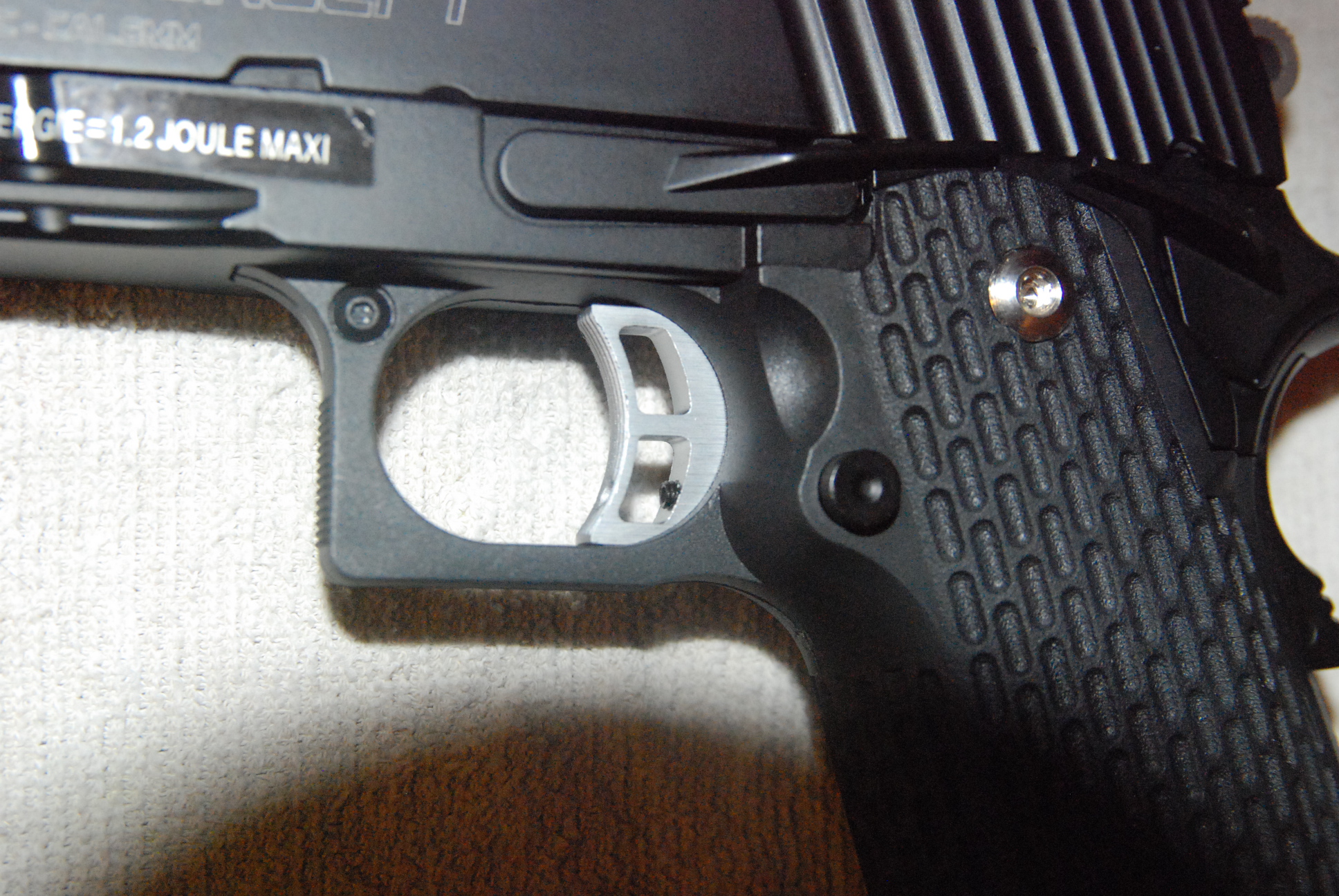 come la sua sorella più piccola, la colt 1911, ha il blocco sicurezza grilletto sull’ impugnatura, molto sensibile basta una leggera pressione e non c’è da farsi venire le formiche alla mano a forza di schiacciare.