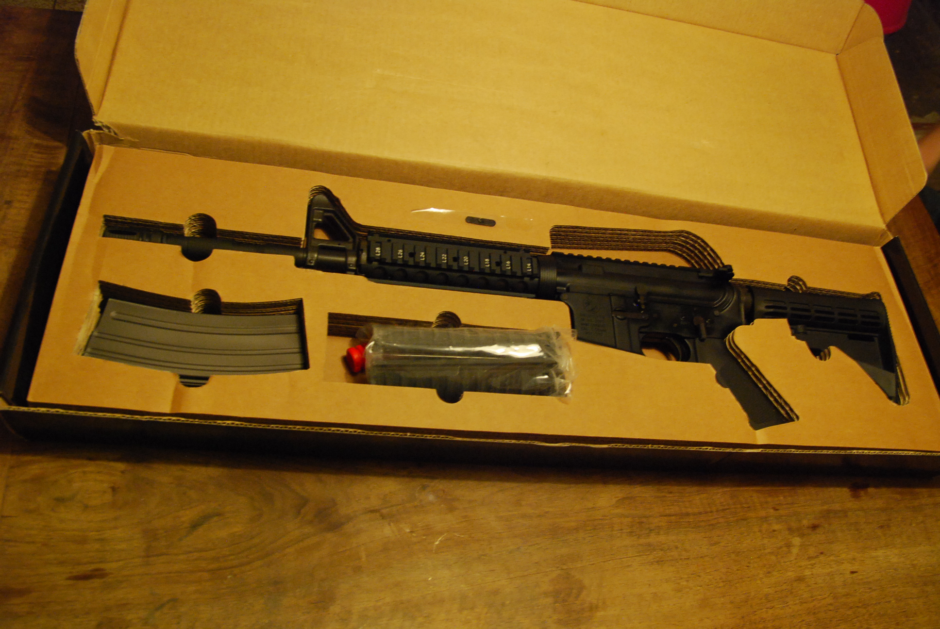 Eccovelo fuori dalla scatola, ricordatevi che di solito il caricatore non è incluso e costa! Notate che insieme al fucile invece vi vengono fornite le placchette copri ris.