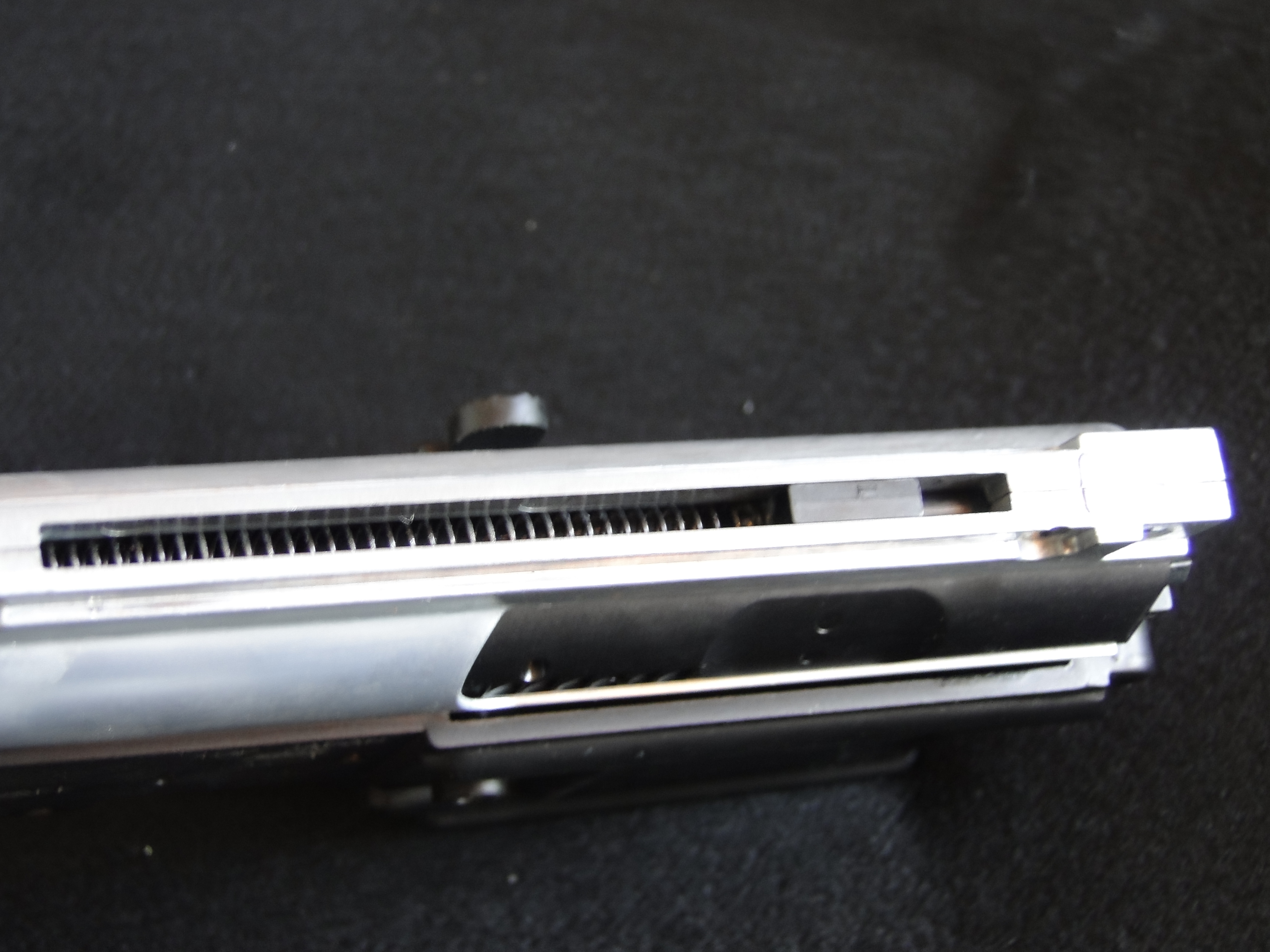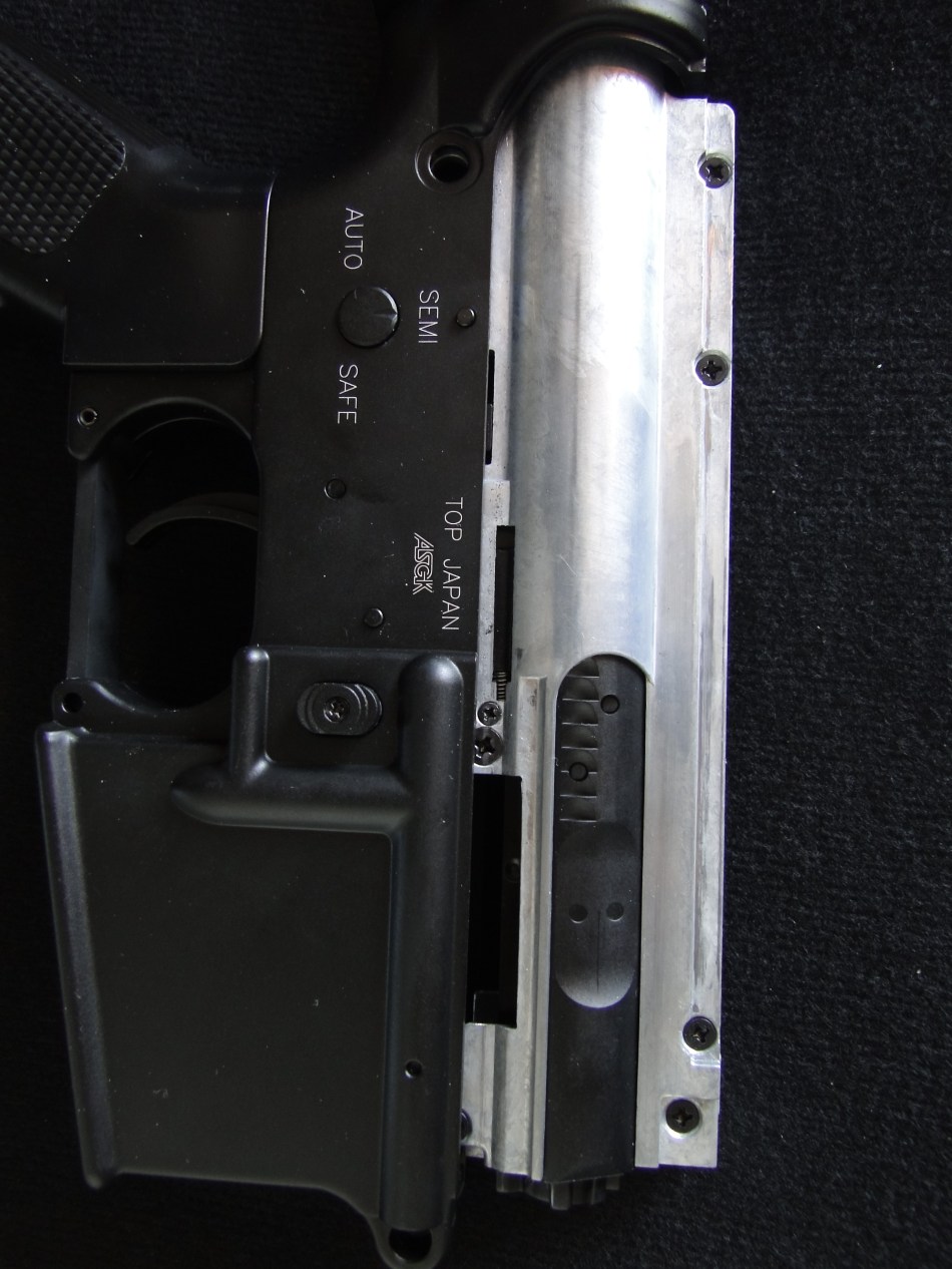Mentre l’arretramnto elettrico avviene tramite denti in metallo posti sotto il bolt/cilindro/spingipallino esattamente come su di un pistone tradizionale, ergo, il “cilindro” del TOP ha i denti, il pistone no e quest’ultimo viene caricato dal cilindro stesso, per rimanere arretrato come avviene per l’ hammer in un m4 vero…ingengoso. Chissà se questa idea non verrà sfruttata in larga scala anche senza shell come avviene per i GBB? Per il Top infatti esiste anche un adattatore che permette di utilizzare questo sistema con caricatori senza le shell.