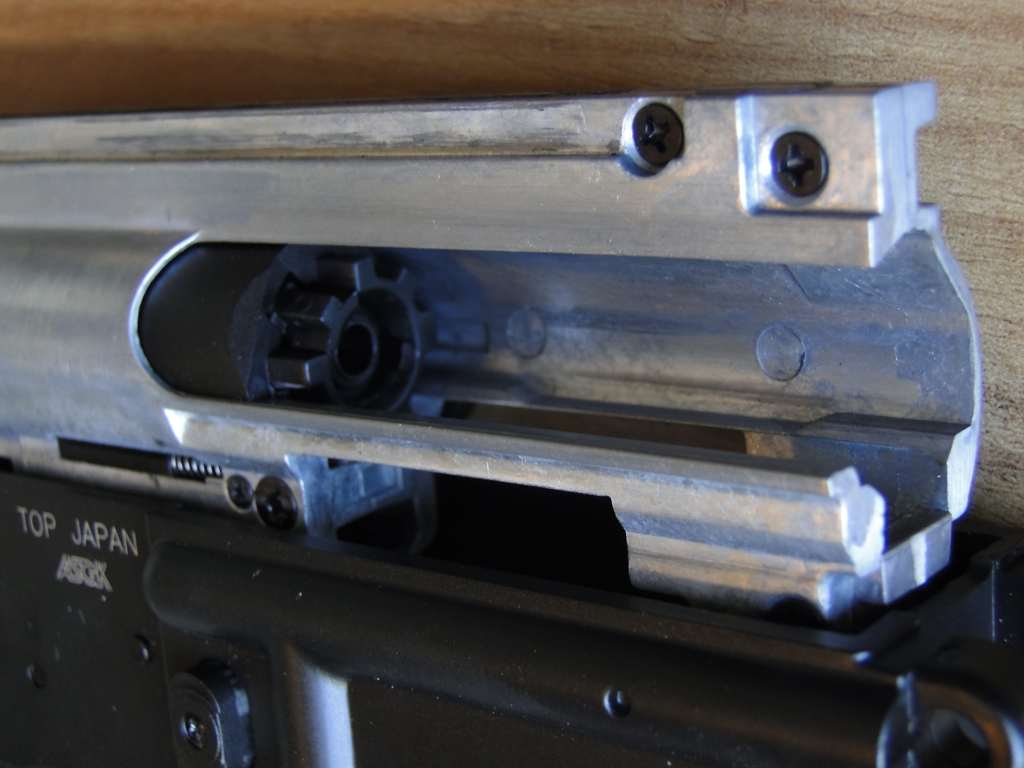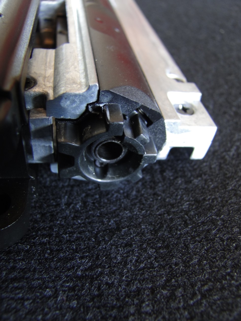 Ma arriviamo alla parte più curiosa è innovativa che è il gear box. Non abbiamo smontato l’intero gear box su richiesta, ma si può notare che il cilindro è praticamente lo stesso bolt che arretra e quindi all’intero del fucile esiste un sistema, capace di rendere indipendente la molla che spinge il bolt/cilindro/spingipallino verso l’incameramento del bossolo e una che spingerà il pistone durante il colpo. infatti una delle caratteristiche più interessanti di questo fucile, è il fatto che il pistone viene a essere liberato direttamente quando si preme il grilletto dando la sensazione netta di sparare un proiettile come nelle repliche GBB, visto il tempo ZERO tra grilletto tirato e partenza del pistone, il quale infatti non deve essere caricato all’indietro prima dello sparo.