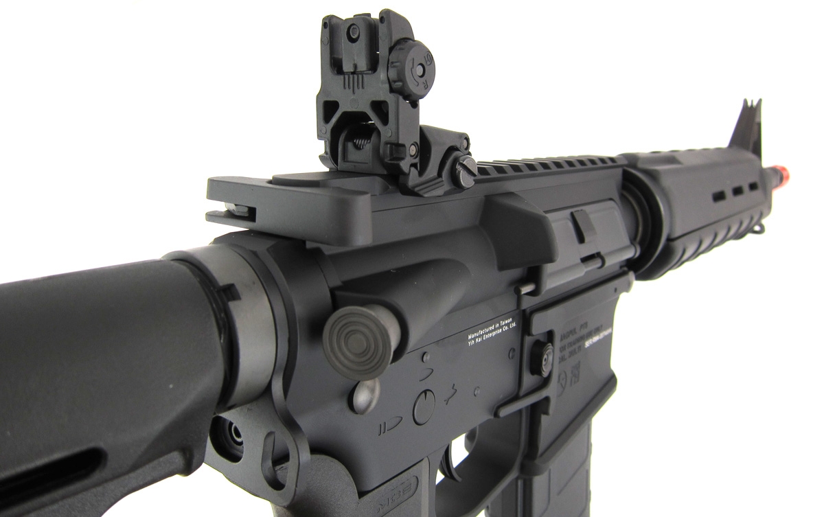 Le implementazioni di riglievo sono, l’aggiunta di un bolt catch funzionante a fine colpi che blocca il sistema elettrico, (solo con i suoi caricatori specifici, ma non esclusivi) che vi chiederà di inserire un nuovo caricatore pieno. Per riarmare basterà schiacciare il bolt relise o semplicemente tirare la leva di armamento, altra ottima opzione.