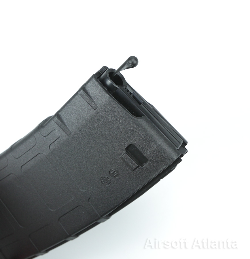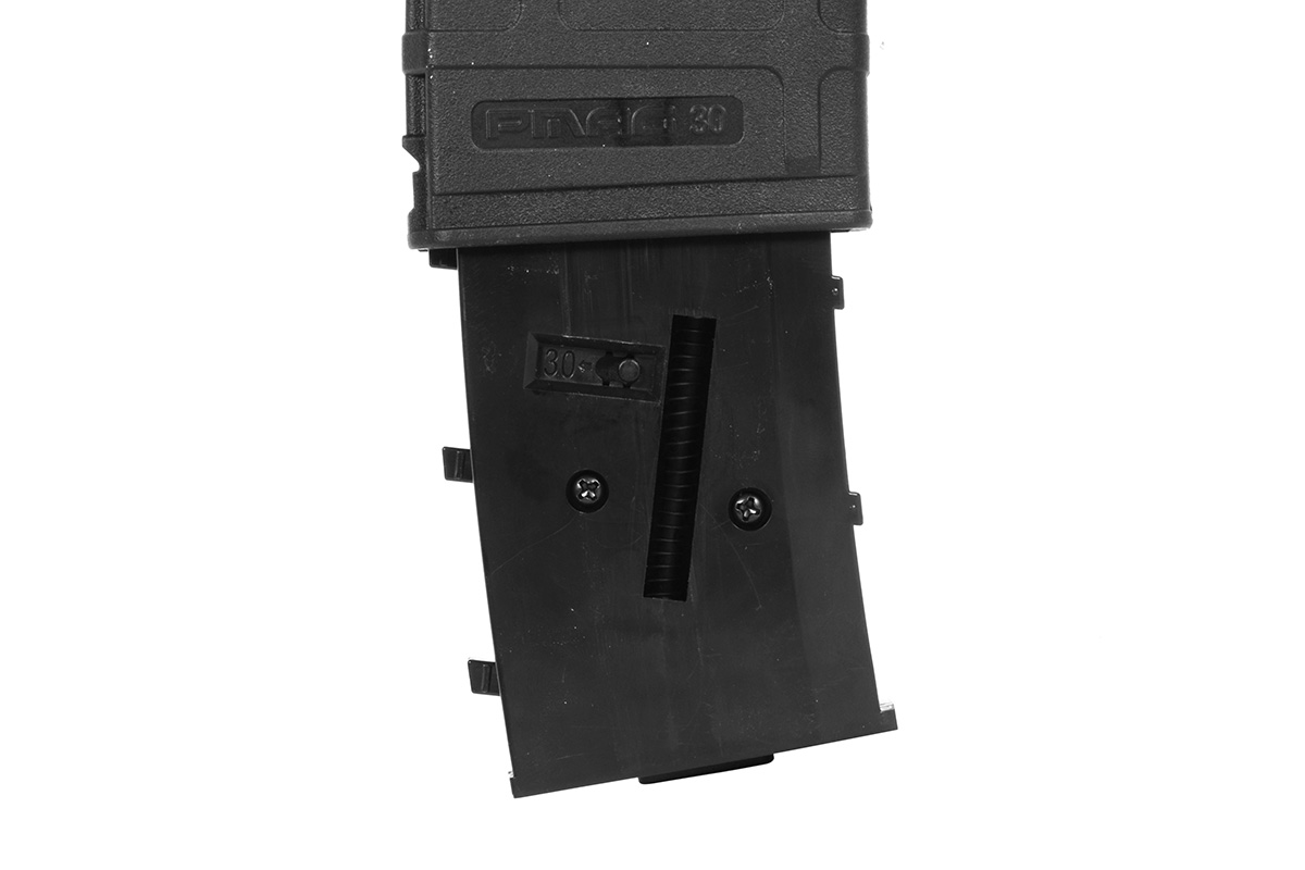come potete osservare dalle foto il caricatore presenta una linguetta, che fuoriesce dall’imbocco e serve a spingere i pallini fino all’ultimo permettendo il conto dei colpi in maniera precisa, mentre sul fondo è presente un altra linguetta più piccola che serve a bloccare il sistema elettrico, inoltre è stata aggiunta una opzione molto utile, soprattutto per chi vuole la simulazione al 100%. Aprendo il fondello del caricatore (senza uso di cacciaviti o altro), premendo semplicemente un tasto sul fondo, fuoriesce l’anima del caricatore, sulla quale, è implementato un selettore preposto a limitare il caricatore da 60 a 30 colipi.