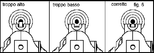 il castello posteriore e lo spillo della mira anteriore devono essere allineati e il pallino sul bersaglio deve arrivare esattamente dove abbiamo mirato.