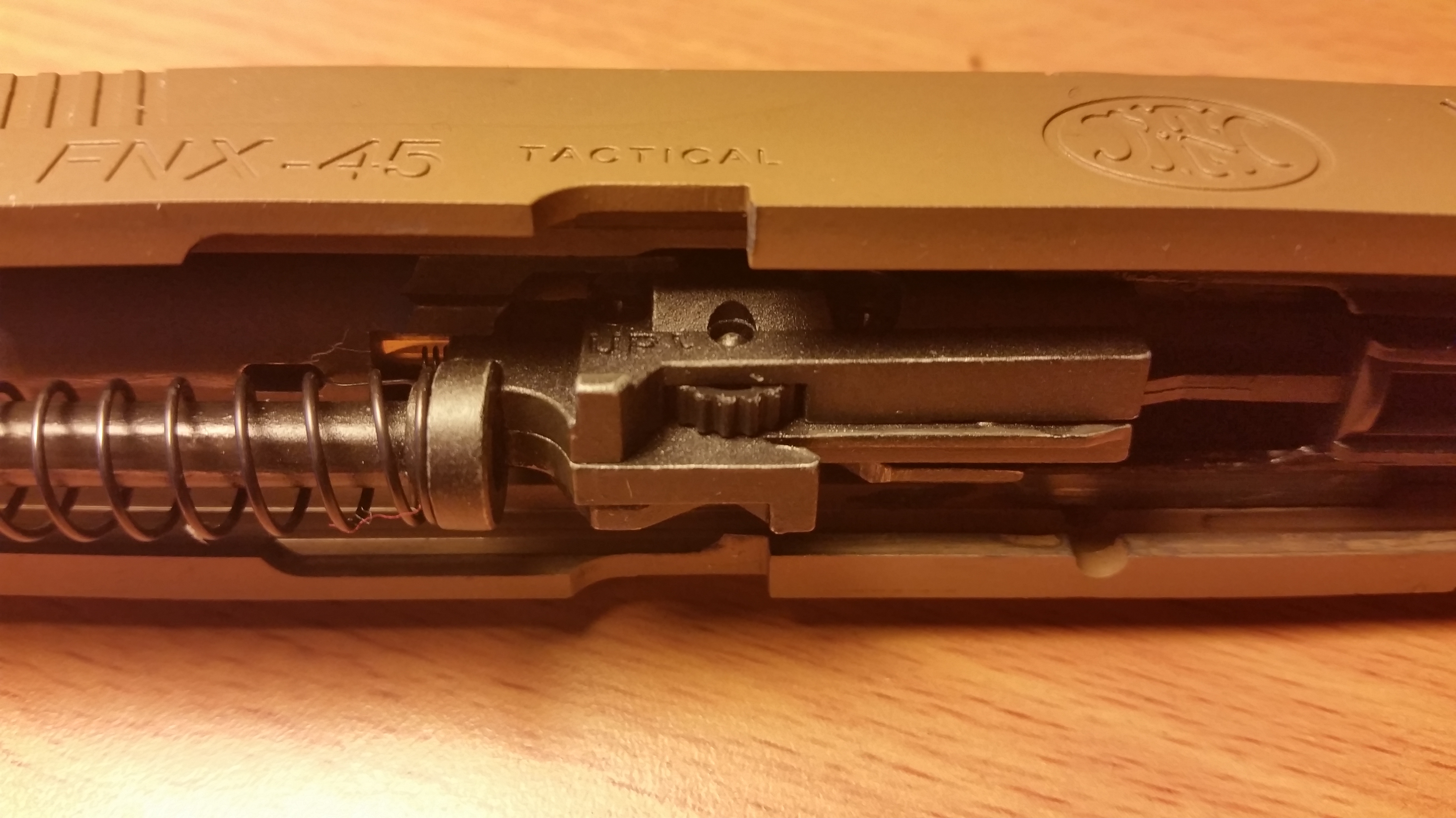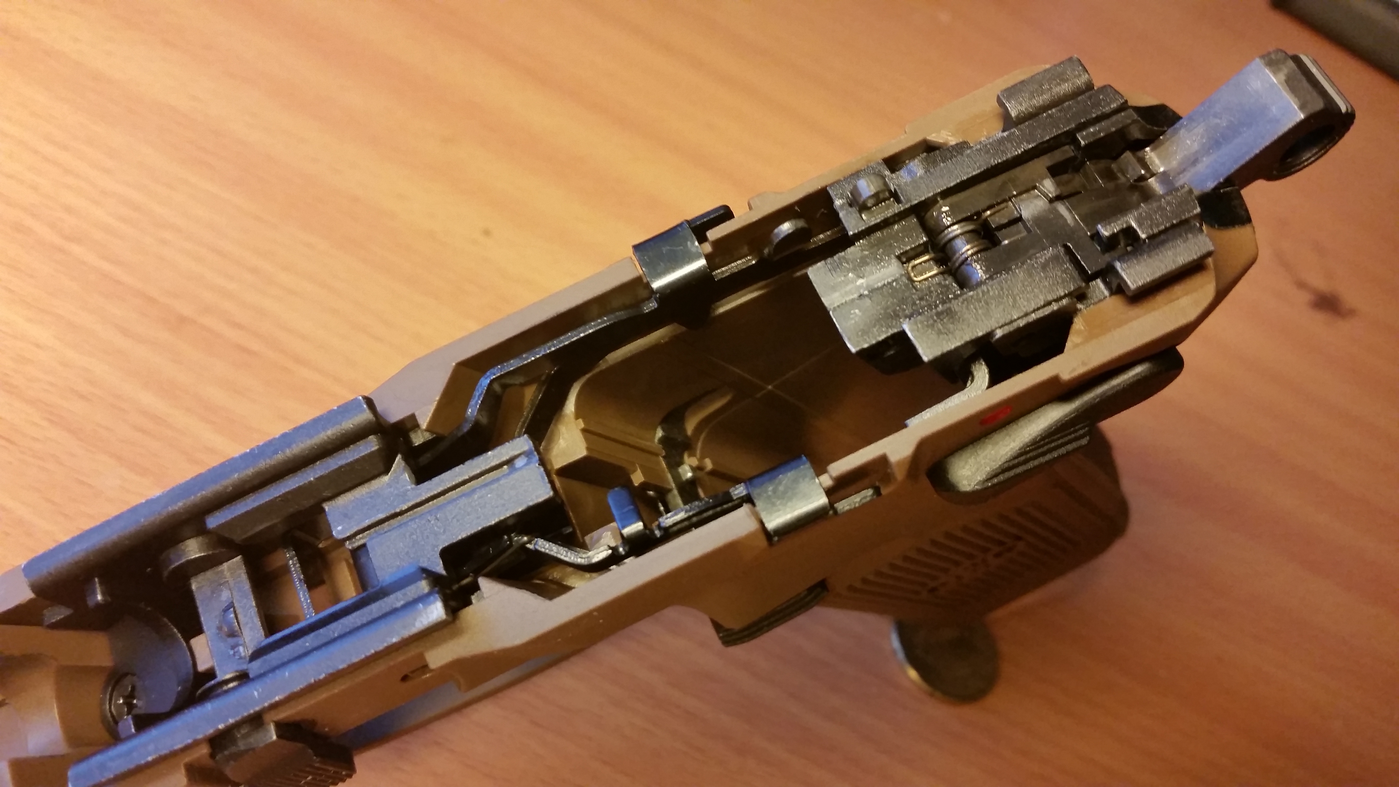 l’hop up si raggiunge molto facilmente a seguito di un altrettanto rapido smontaggio tramite leva posta sulla sinistra del arma, dividendo la pistola in due, carrello, canna, sistema di propulsione molla di ritorno e quant’altro una parte e il lower con il gruppo di scatto dall’altra senza che pezzi volino in giro o molle saltino a tradimento.