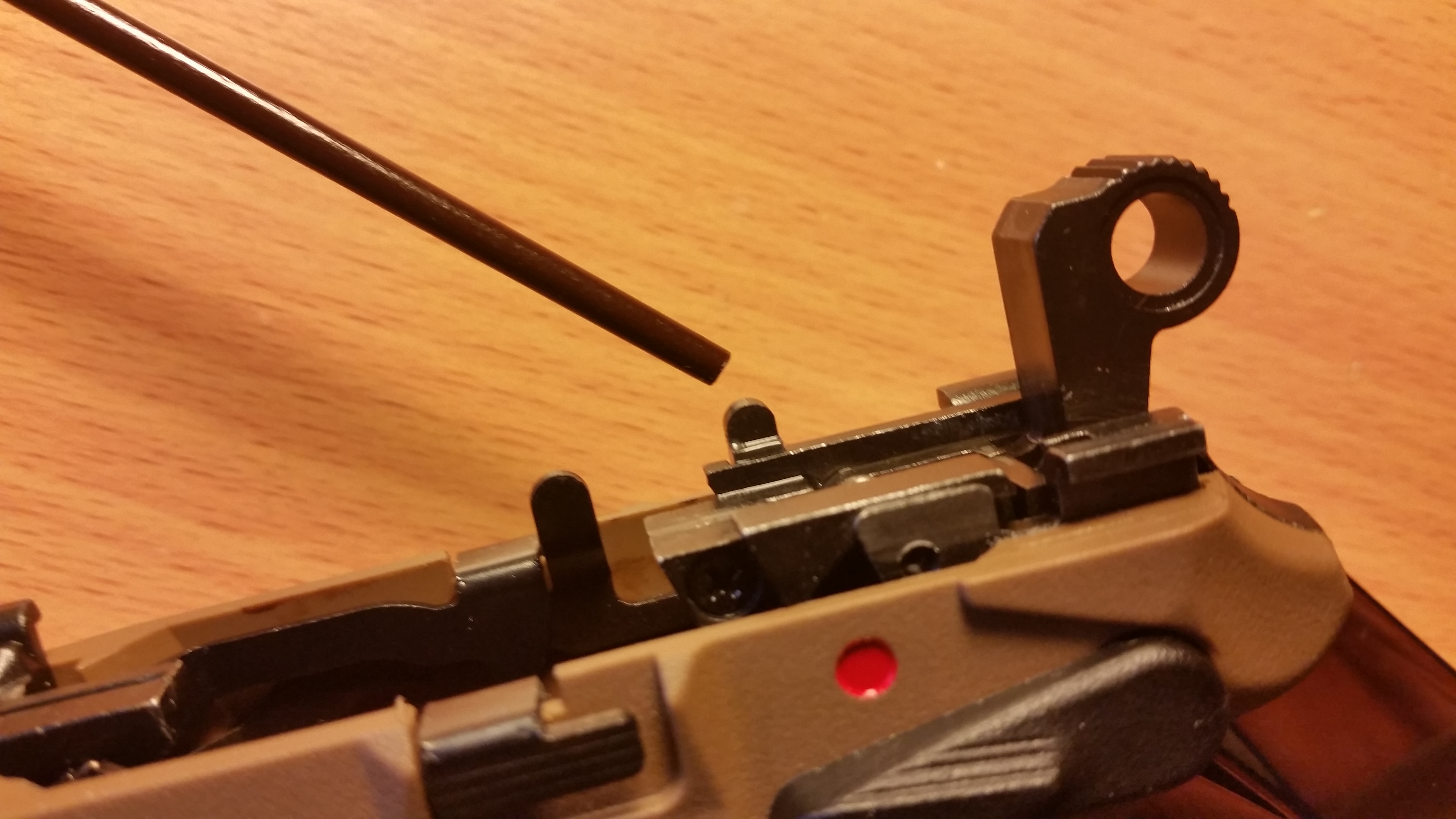 il gruppo di mira è ben realizzato in quanto nell’originale sono presenti dei cristalli di trizio per l’illuminazione notturna mentre nella replica invece sono state forate da parte a parte e troviamo un inserto in plastica trasparente che genera una certa luminosità alla presenza della luce diurna o illuminazione artificiale che rende più agevole la mira.