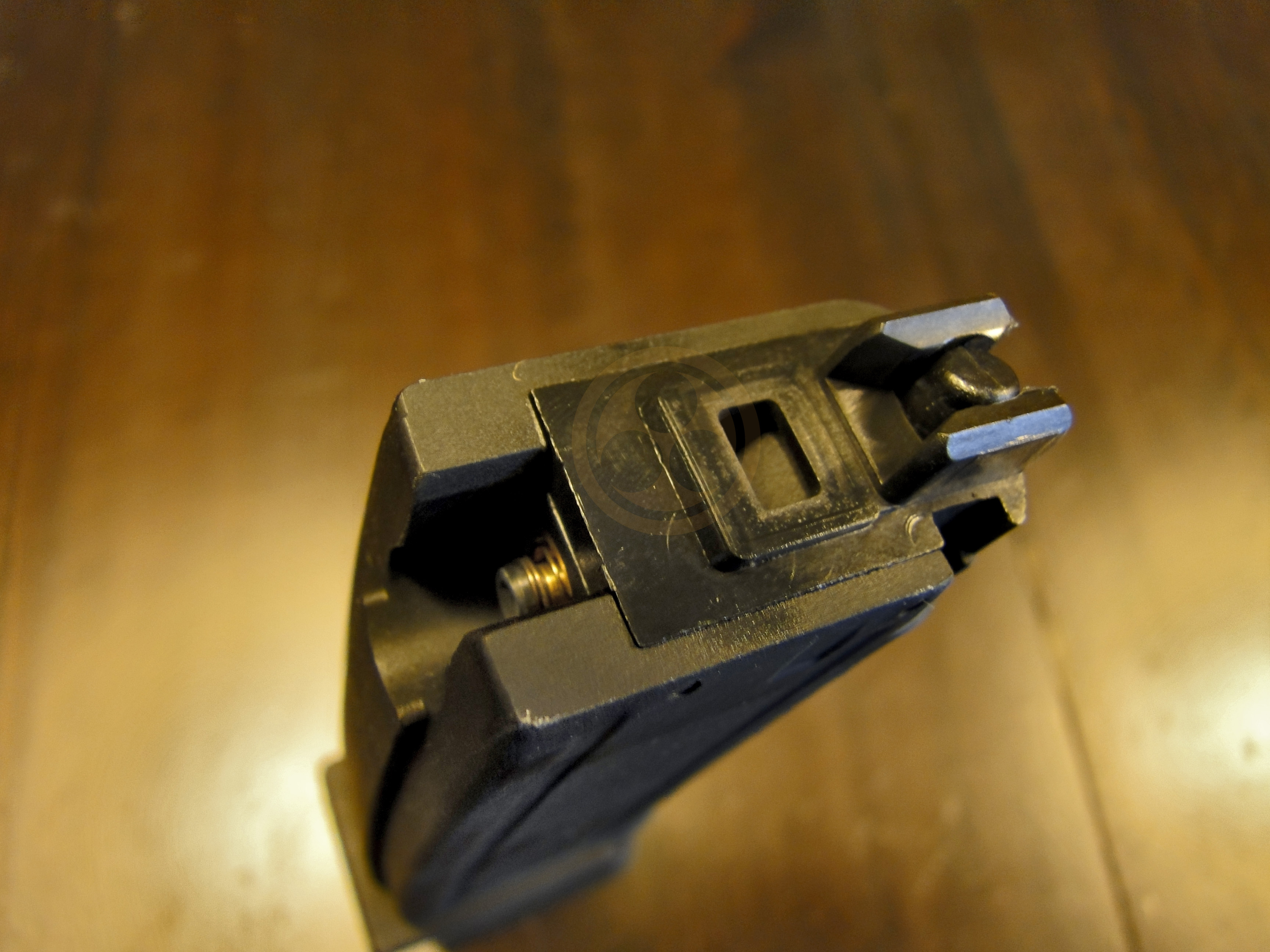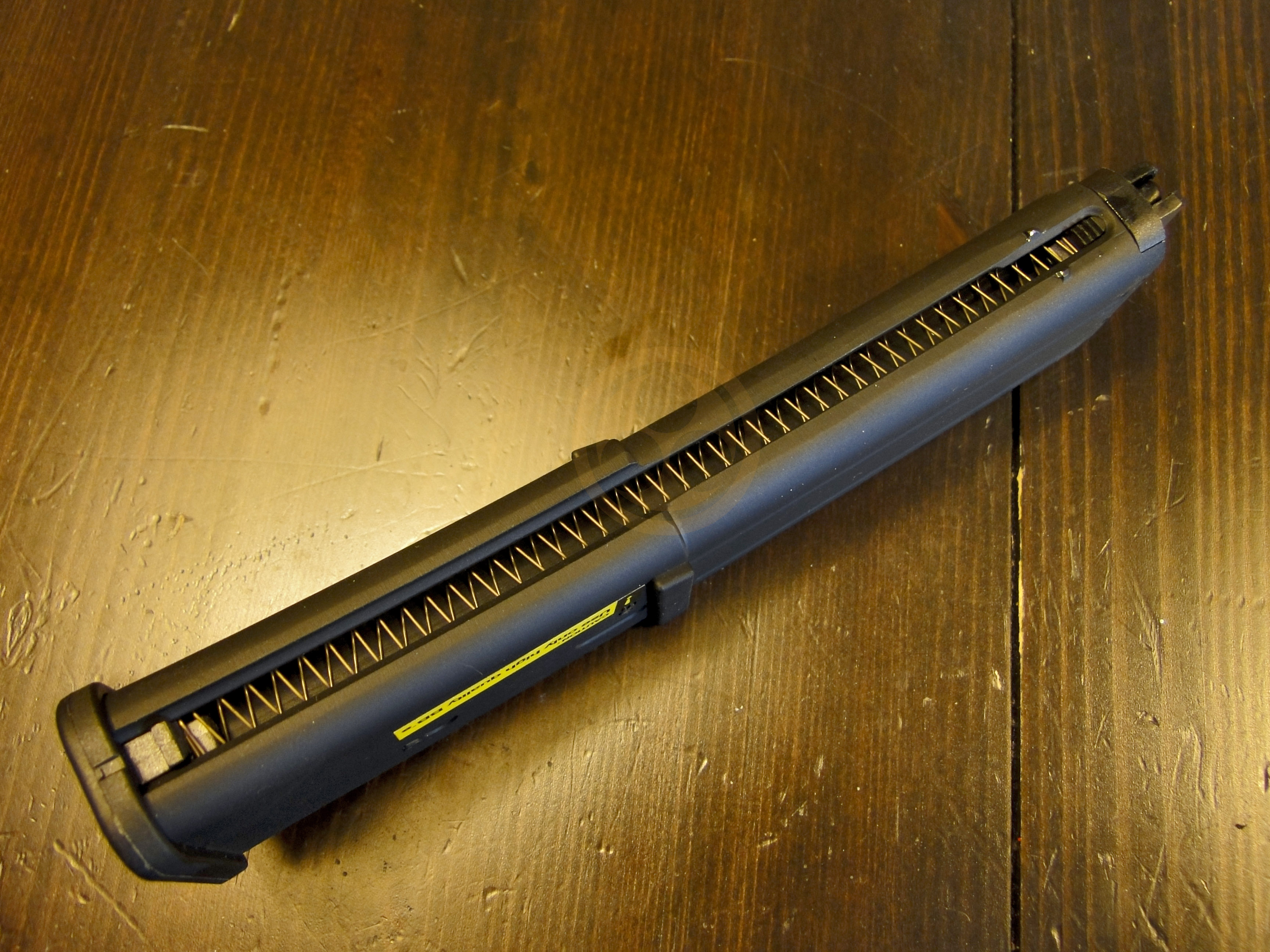 Il caricatore (pesantissimo) carica fino a 35 colpi utili, si può riempirlo fino a 44 ma rischia in quei casi di bloccare i colpi e di non pescare. L’inserimento dei bb è laterale.