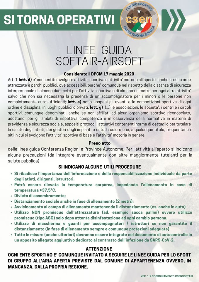 Per quanto concerne il punto 8 del nostro protocollo, dal momento che ci sono linee guida emanate da organismi superiori che permettono di svolgere attività motoria senza indossare la mascherina, specifichiamo che questa circostanza è valida anche per il softair. Pertanto durante le fasi attive dell’allenamento sarà possibile non indossare la mascherina, mentre resta obbligatorio indossarla durante la fase di preparazione, durante le pause e al termine dell’allenamento prima di ripartire con l’auto. Tuttavia vi consigliamo di tenere la mascherina sempre e comunque a portata di mano in modo da potervi proteggere nel caso in cui entriate in contatto con viandanti vari o vi avvicinaste ad altri atleti (distanza minima 2 metri).