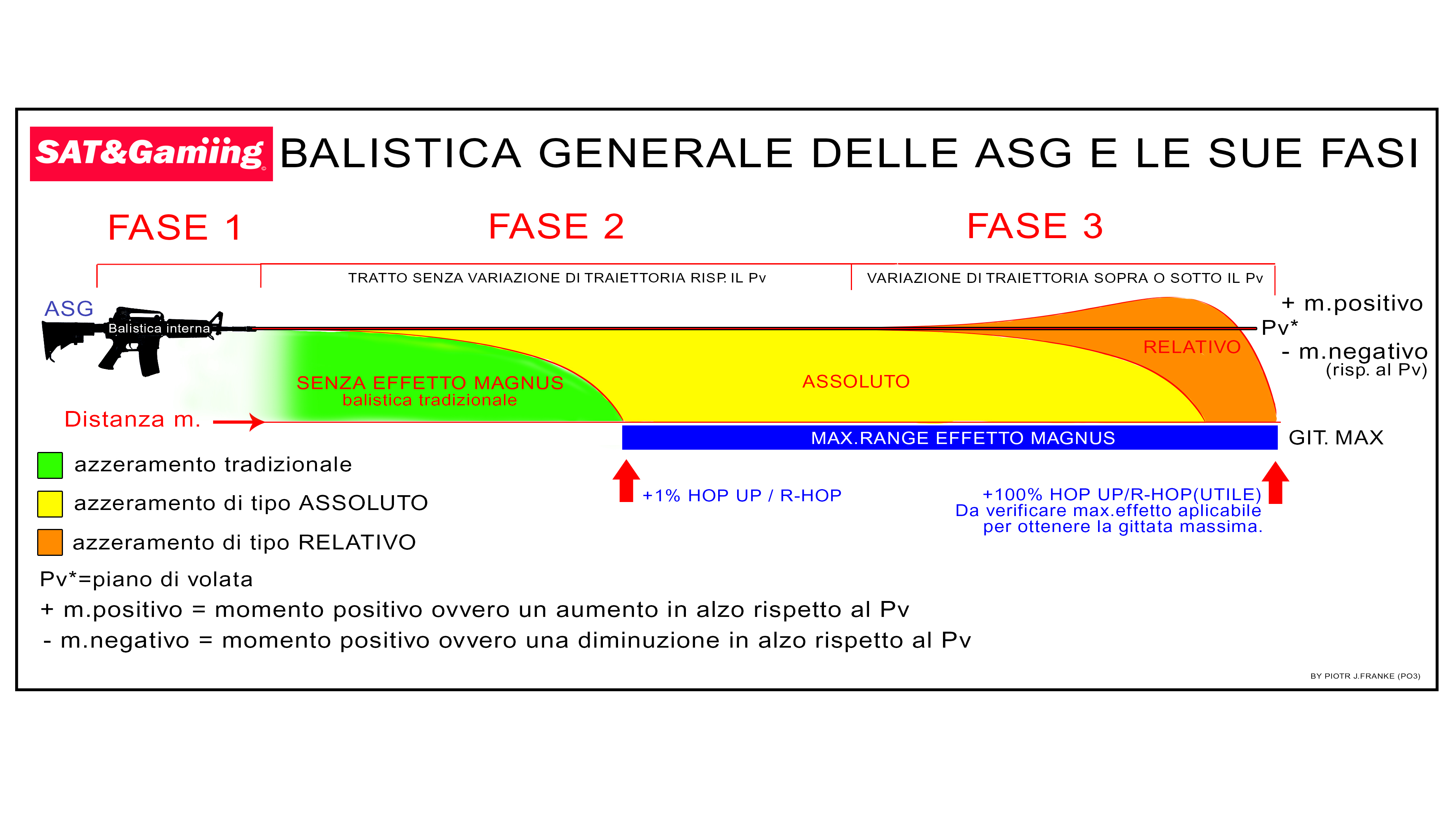 Le piattaforme ASG con sistemi di effetto Magnus Hop Up R-Hop, hanno una balistica più articolata, che si deve dividere in 3 fasi principali invece che 2, e questa divisione vedremo che sarà fondamentale, per poter definire i sistemi di azzeramento delle pistole e dei fucili.